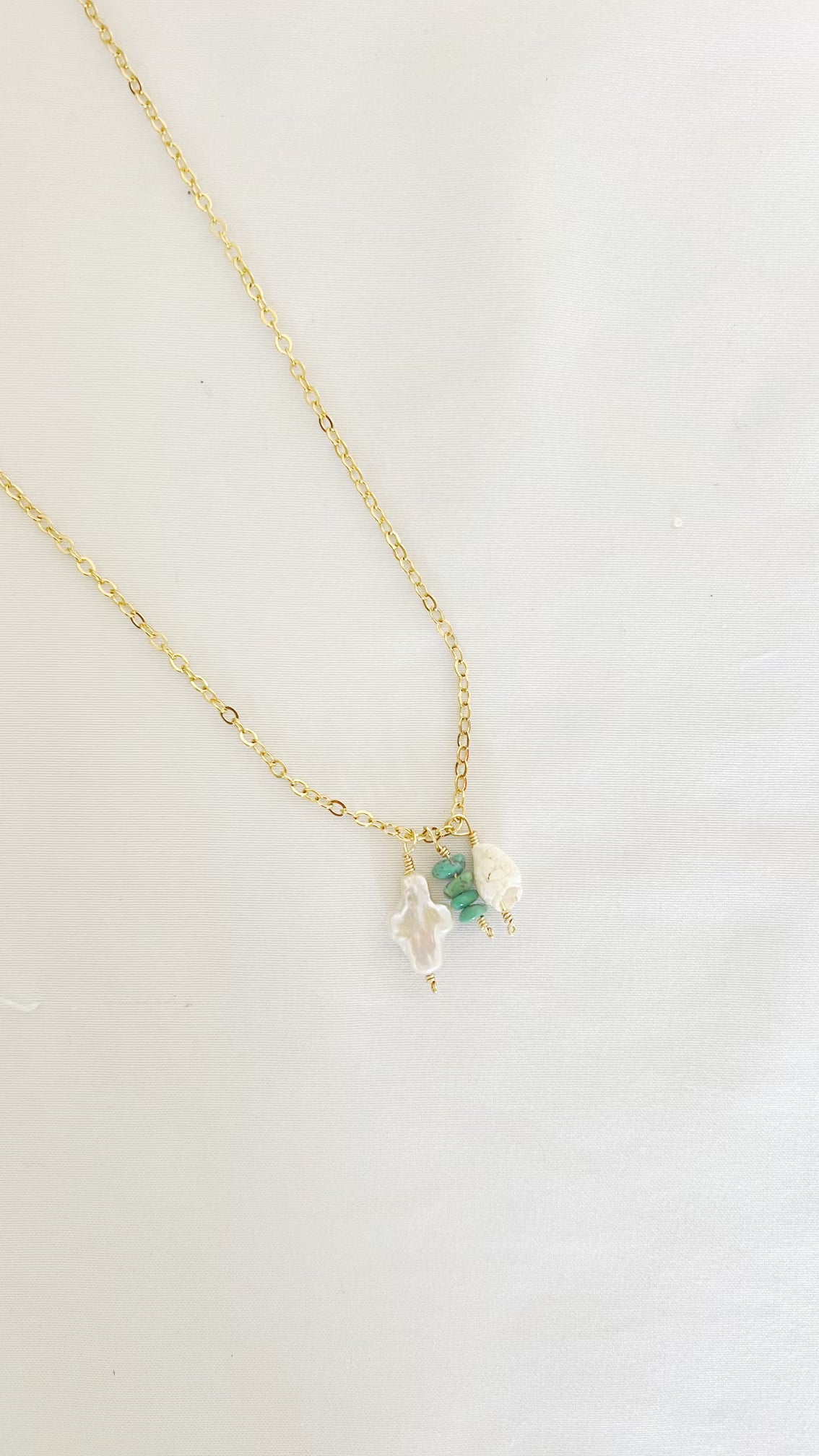 Introducing our 14k gold filled chain necklace adorned with a trio of exquisite charms: a pearl cross, turquoise stones, and a delicate shell. The gold chain provides a luxurious backdrop, enhancing the elegance of the pearl cross charm. The turquoise charm adds a pop of vibrant color, while the shell charm brings a touch of coastal beauty. This versatile necklace is perfect for adding a unique and stylish touch to any outfit.